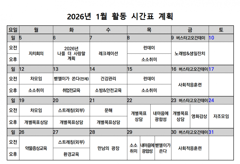2026년 1월 주간재활프로그램 안내입니다.